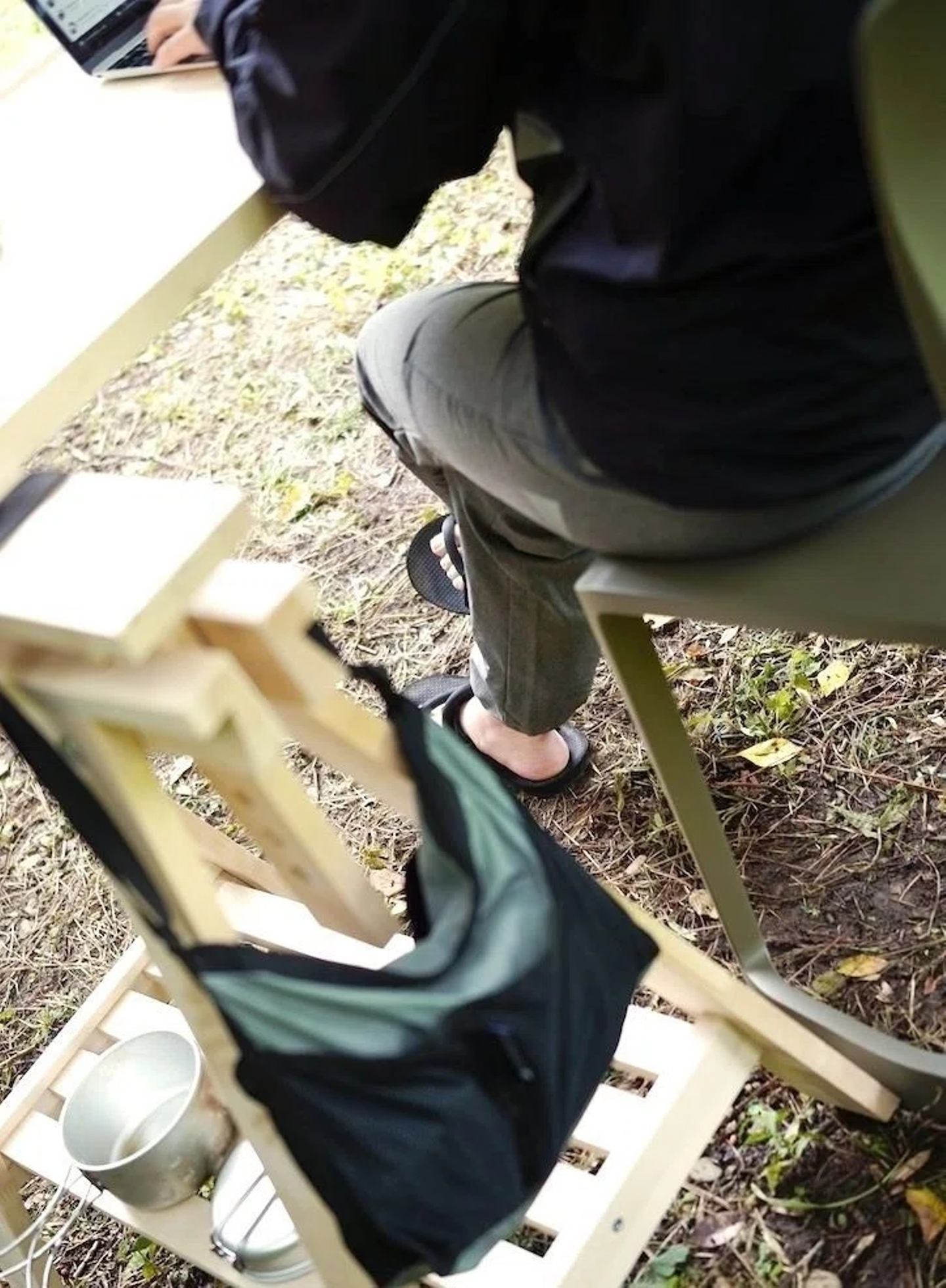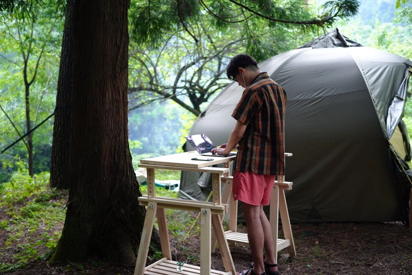 PC作業はテントの中のデスクで。打ち合わせは、木の下にあるスタンディングデスクに移動してzoom会議と、フレキシブルな家具なので業務に合わせて場所を移動。会議では打ち合わせ相手に「バーチャル背景じゃないんですか!?」ととっても驚かれます。グリーンの背景も手伝って、心なしか打ち合わせに参加者みんなの笑顔も増えるような...笑
