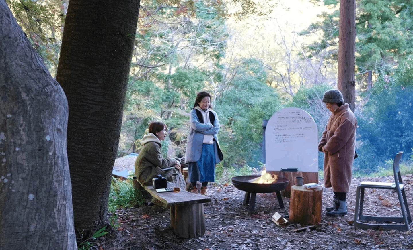 当日は、自然の中で個々人の仕事をしたり、焚き火を囲み次期アクションのブレストまで!普段忙しいママでもある3名にとって、森ワークが仕事と趣味が重なるリフレッシュ機会にもなったそうです。