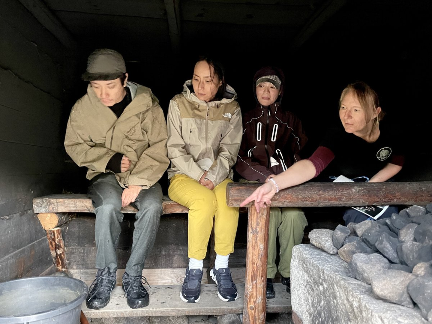 サウナ小屋にてレクチャーを受けるトレイルヘッズメンバー。
