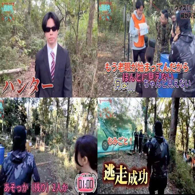 今回の忘年会の企画はバンド演奏だけではありません。なんとあの「逃走中」のパロディ企画を本気で事前撮影。若手社員・組織長が入り混じって山の中でガチロケを敢行!木々の間を逃げて隠れて追われて捕まって… の迫力映像が会場に流れます。
