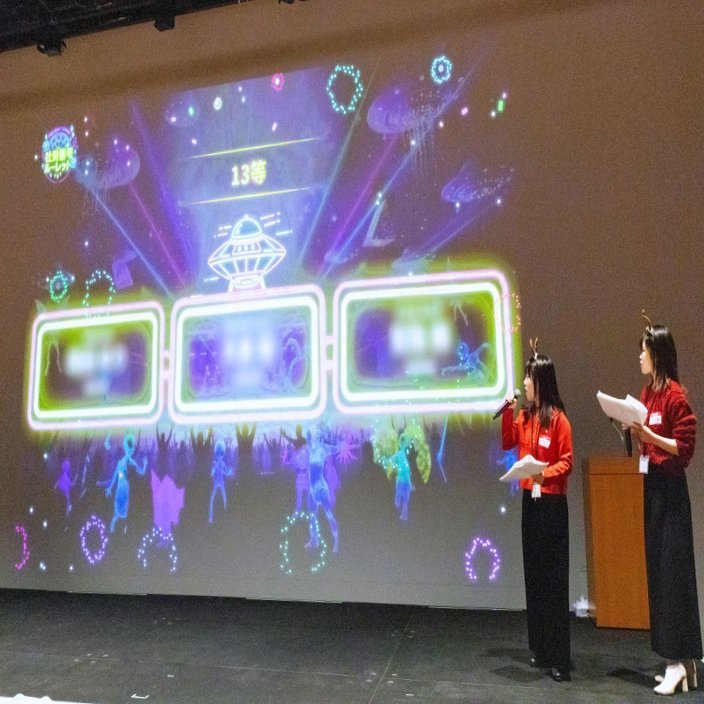 「単純に面白い企画を考えるだけでなく、忘年会全体の流れや来場者が楽しめる構成を意識しながら、他部署の方々と話し合って作り上げる過程にやりがいを感じました。当日は壇上から参加者のみなさんの楽しそうな表情を見ることができ、企画に関われて良かったと実感しています。メインテーマである『ロック・バンド』に合わせ、ロゴやアプリ、スライドまで統一感を大切にした点も、今回の大きなこだわりです。」