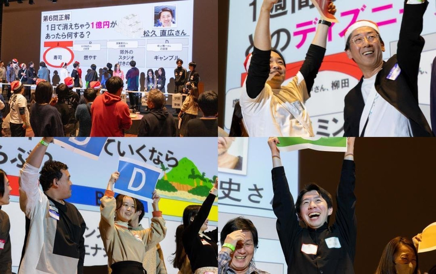続けて、組織長にまつわるクイズ大会。各部署から計10チームが参戦です。「無人島にひとつだけ持って行けるなら?」「一週間なれるならどのディズニープリンセス?」など、ユニークな質問に意外な回答が続出!