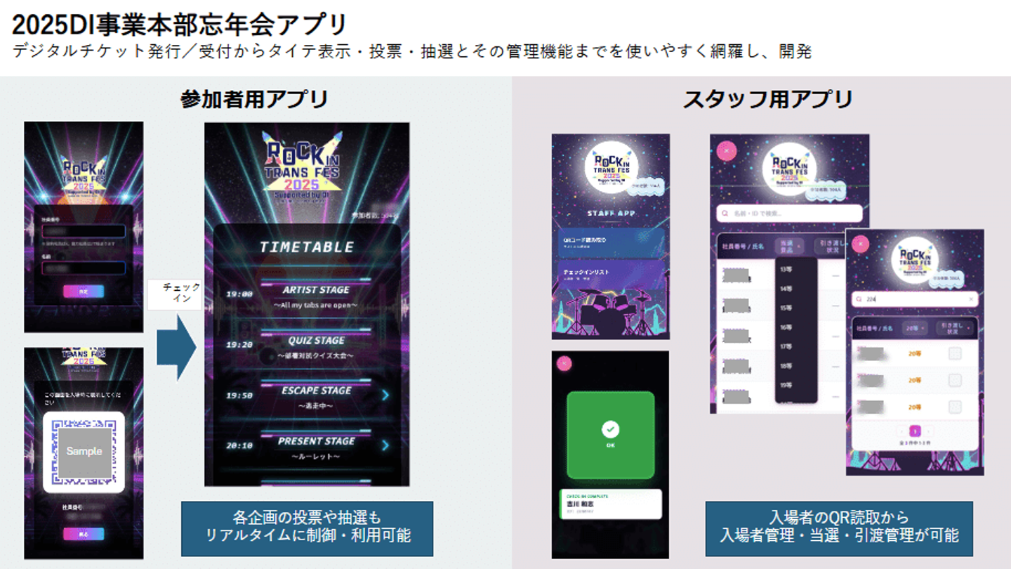 忘年会のタイトルは「ROCK IN TRANS FES 2025」。組織長で編成されたロックバンドによる演奏、クイズ大会、会場チェックインでエントリできるアプリを活用した大抽選会など、盛りだくさんの企画を用意しました。