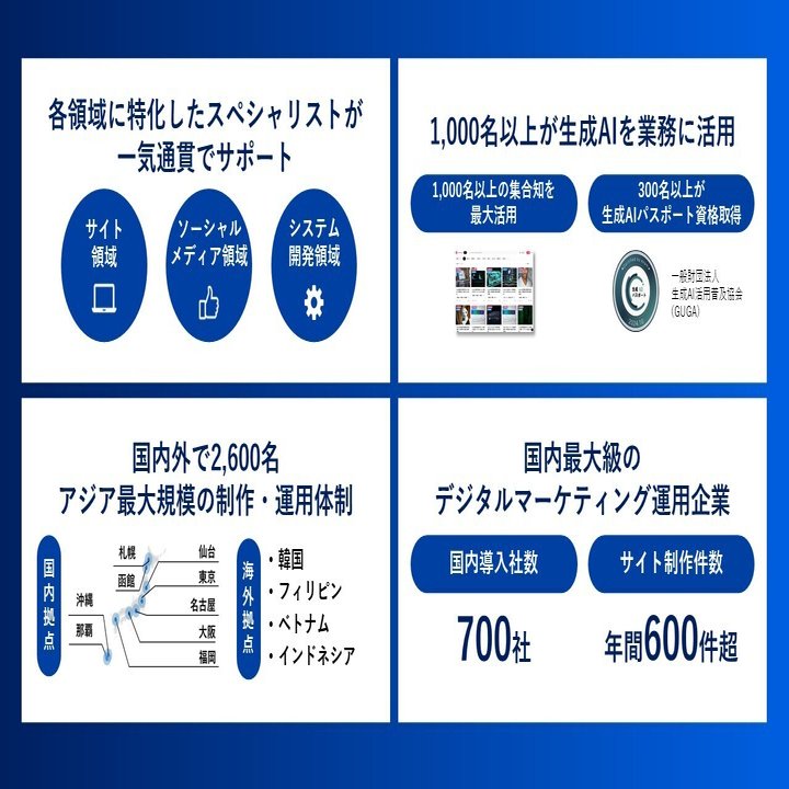 Webサイト構築・運用、オムニチャネルマーケティング、分析・リサーチサービスなどを軸に、ソーシャルメディアやLINEを活用したコミュニケーションサービスや、デジタルマーケティングツールの導入支援、AIで進化する独自のDMPを活用した統合マーケティングの提供など、最先端のデジタルマーケティングサービスを提供します。