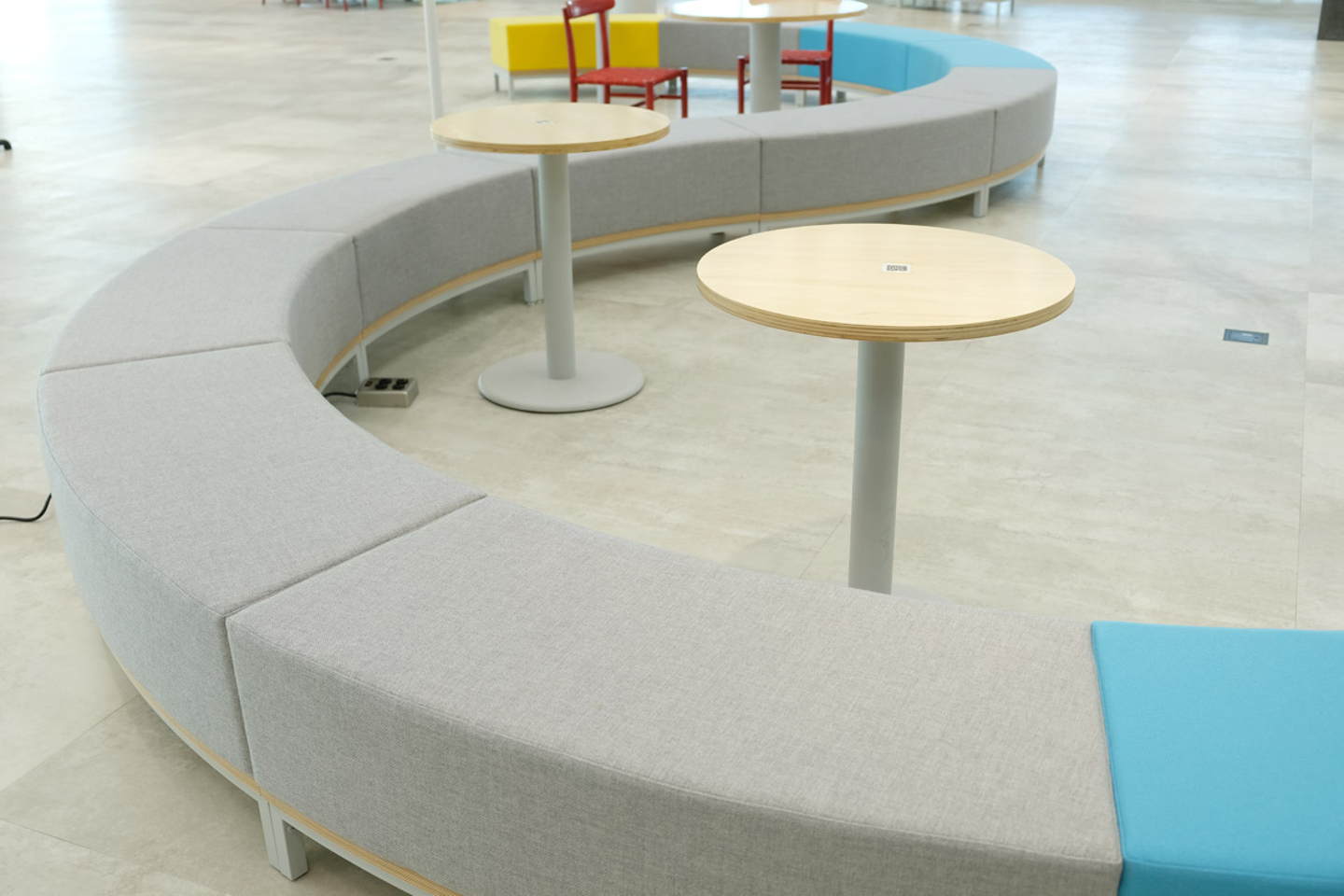 続いてエントランスから奥の方には、よくカフェにも設置されていて、勉強している方のいる大型テーブル席。