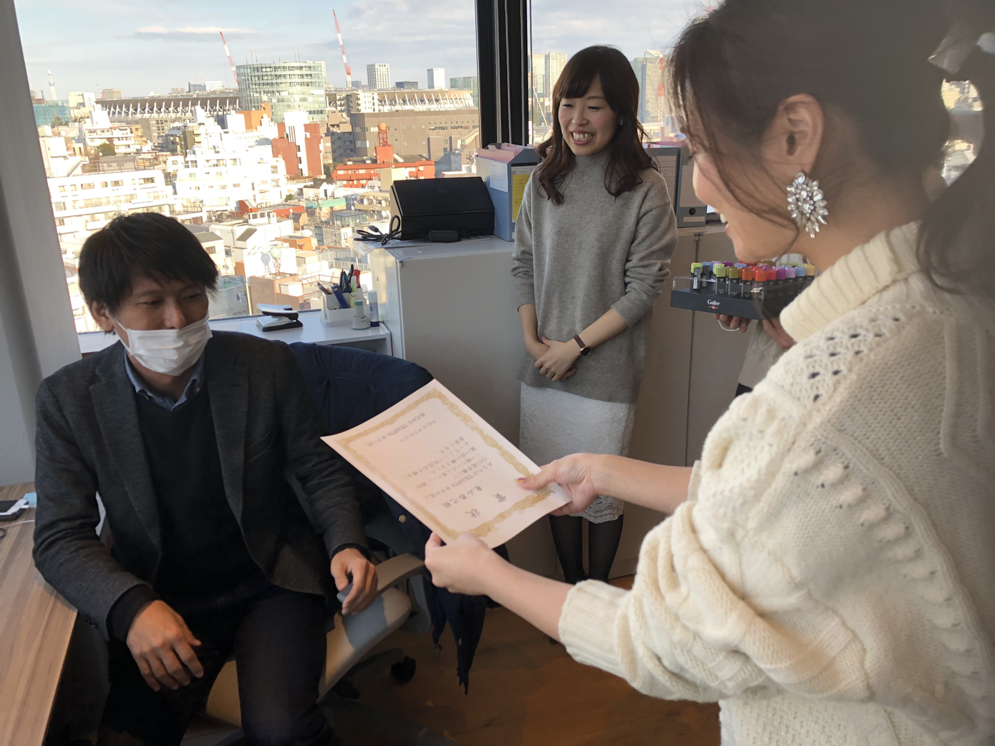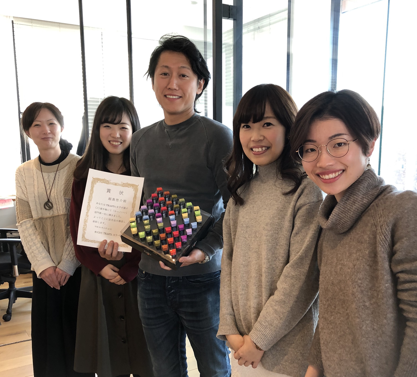 男性社員全員に賞状を読み上げ、チョコレートと一緒にお渡ししました。