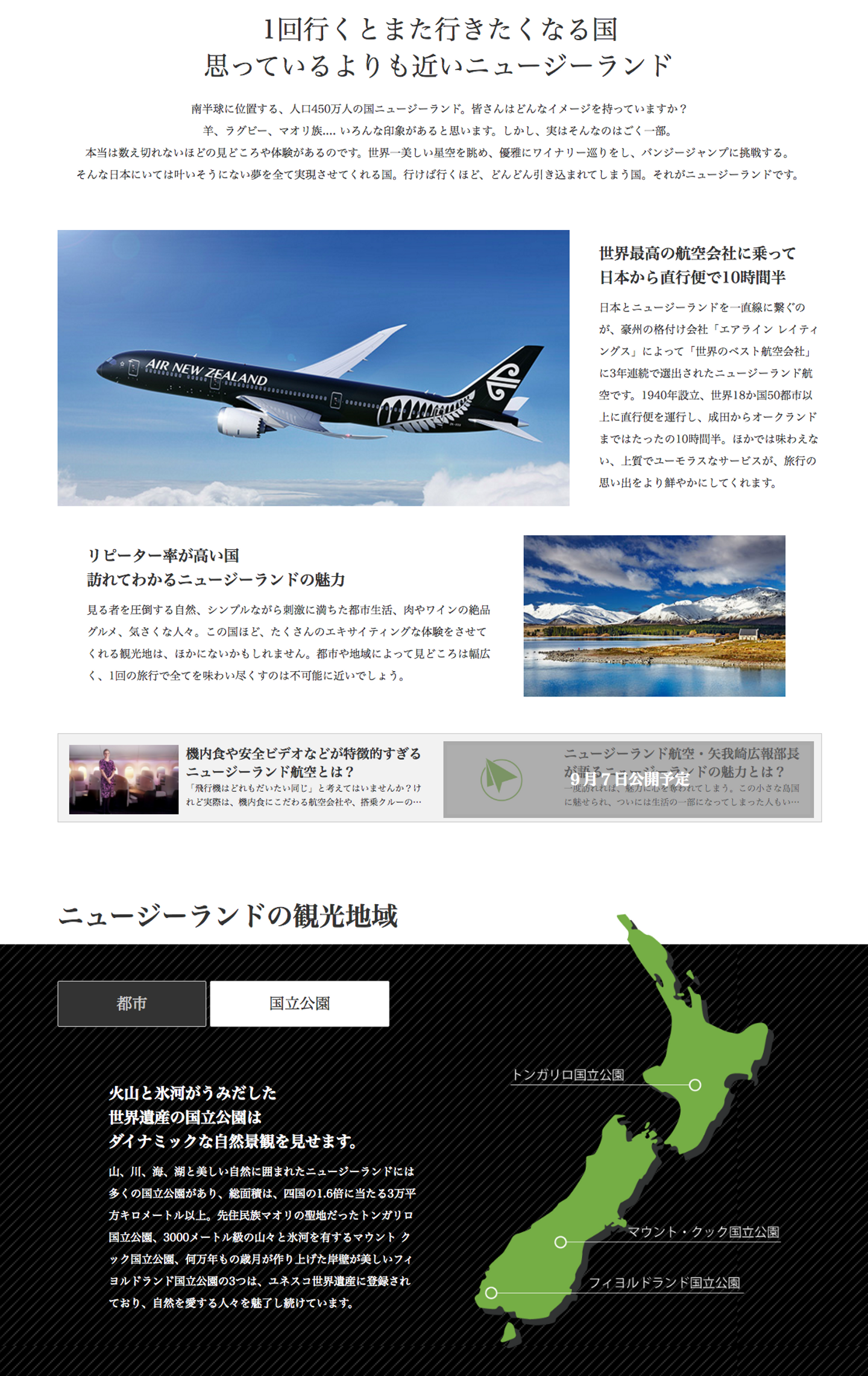 “世界一の星空”といわれるテカポ湖の絶景星空や、映画「ロード・オブ・ザ・リング」「ホビット」のロケ地にも選ばれた雄大な自然、ラム肉やシーフードといった人気グルメ等々。さまざまな角度からニュージーランドの魅力を詳しく紹介しています。