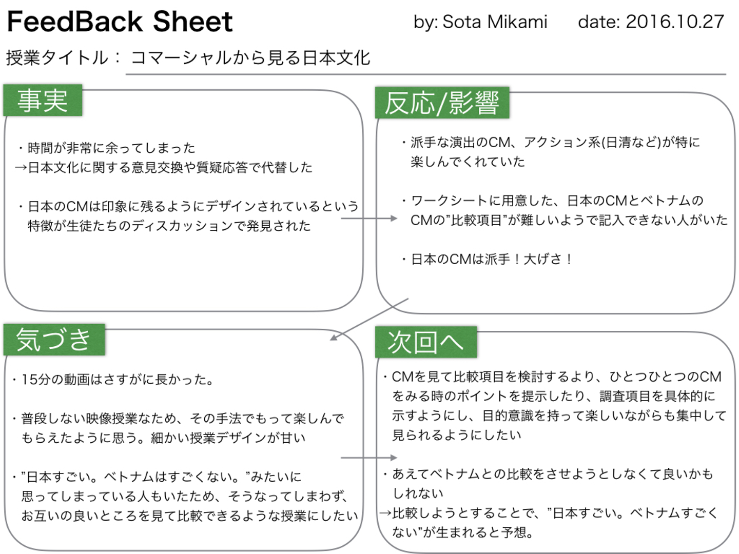 ここには次回同様の授業を行う時、同様でなくとも次回からの授業作りや実施に活かしたいこと、改善したいことなどを書きます。個人的にはここが一番大事に思っています。