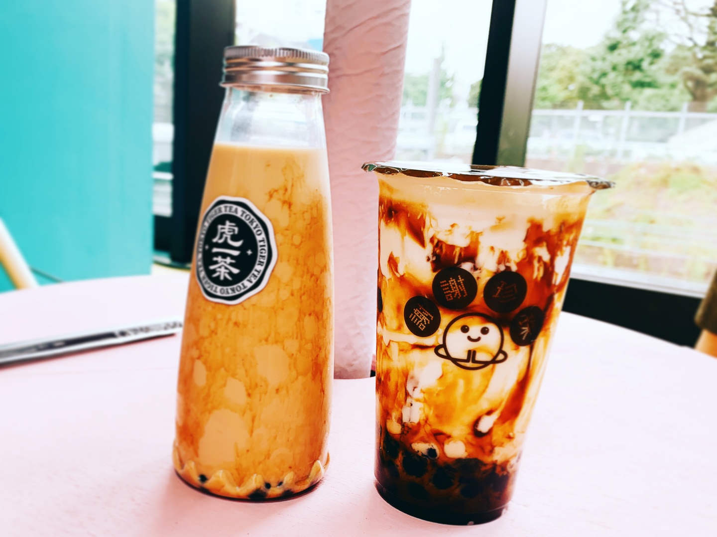 (左) 虎一茶黒糖タピオカミルクティー Lサイズ ¥800 / 虎一茶