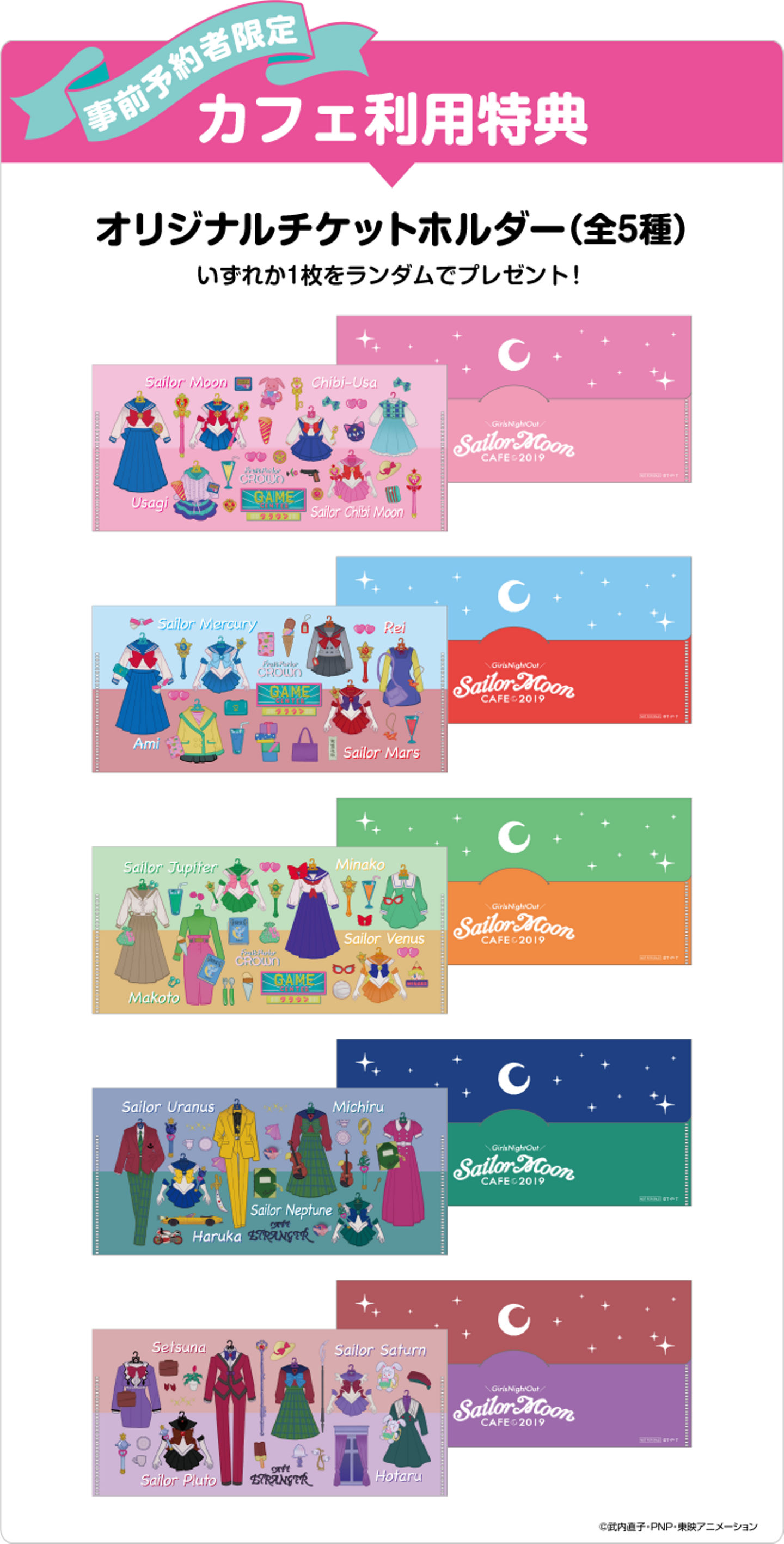 専用サイトで事前予約(1名につき650円+税)をすると優先的に入店でき、メニューを注文すると「オリジナルチケットホルダー」(全5種)がランダムで1枚もらえます。