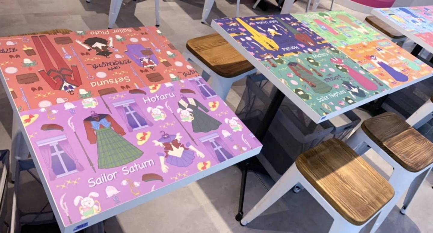 テーブルにはそれぞれのセーラー戦士のイメージカラーとモチーフがちりばめられています。