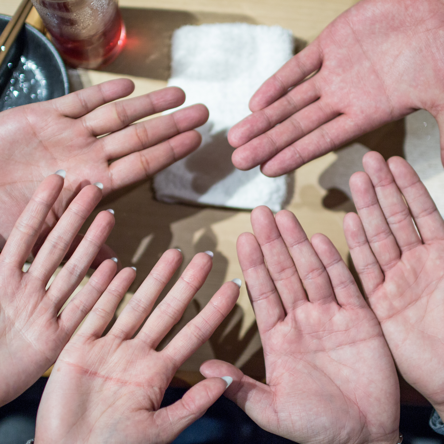左上から池田さんの右手、龍村の両手、社長の両手、杉山の左手