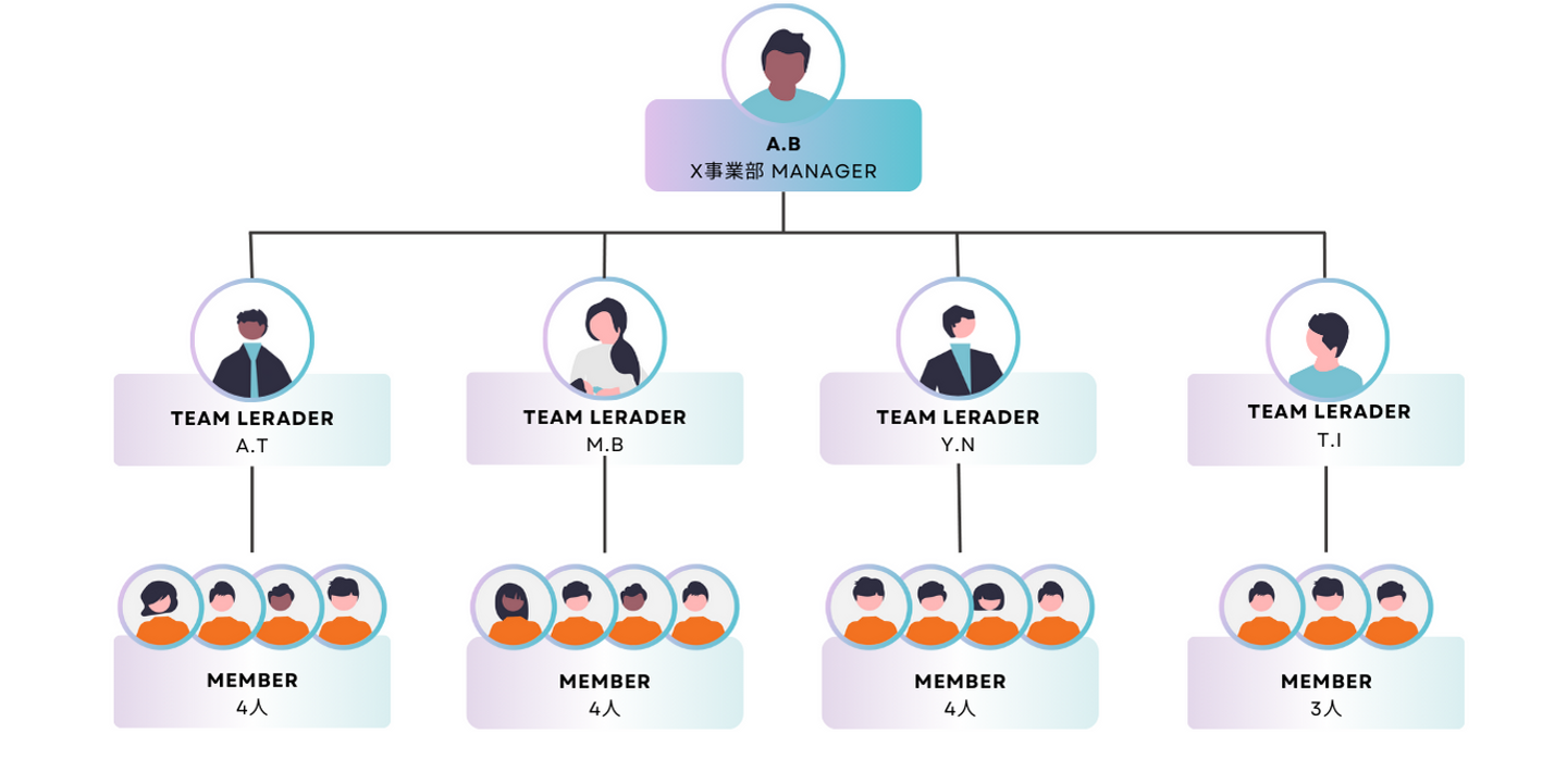 例としては、一つの事業部ごとに少人数制のチーム編成があり、気軽に連絡が取れるようになっております。(下記画像参照)