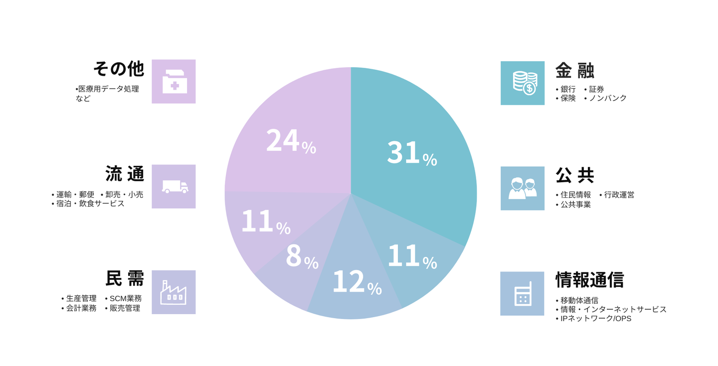 業務領域としては、金融機関や情報通信、公共機関がメインとなっております。さまざまな業界の開発において、一つのプロジェクトごとに設計からテストまで携わることが多く、総合的なスキル発展を目指すことができます。またステップアップを重ねるとマネジメントにも挑戦できます。