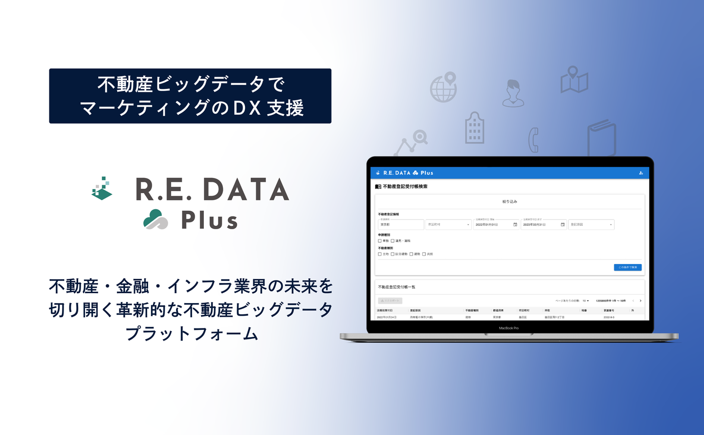 「R.E.DATA」は、インターネット上に存在しない役所、法務局や現地のみに存在するアナログな不動産情報を中心にビッグデータを形成し、法人顧客に対して、オーダーメードでデータを収集・分析・整備し、マーケティングに関する課題を解決するサービスです。