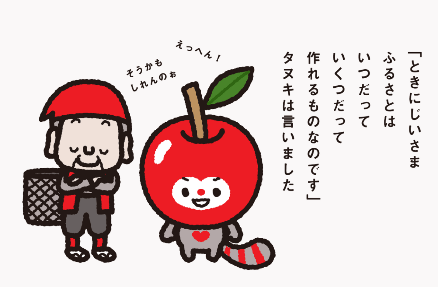 最初のストーリーに登場するチョイタは、北海道をイメージしたメロンの被り物をしていました。ただ、特定の都道府県のチョイタだけをストーリーに含めるのはひいきになってしまうと思いました。そのため、チョイタの被り物を一つの都道府県に限らず多くの産地を持つリンゴに変更しました。