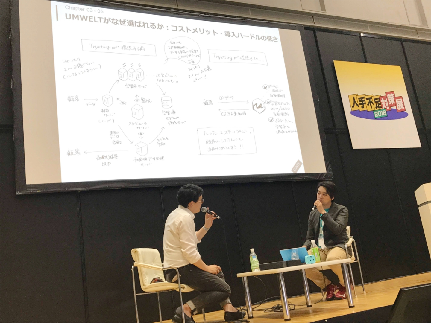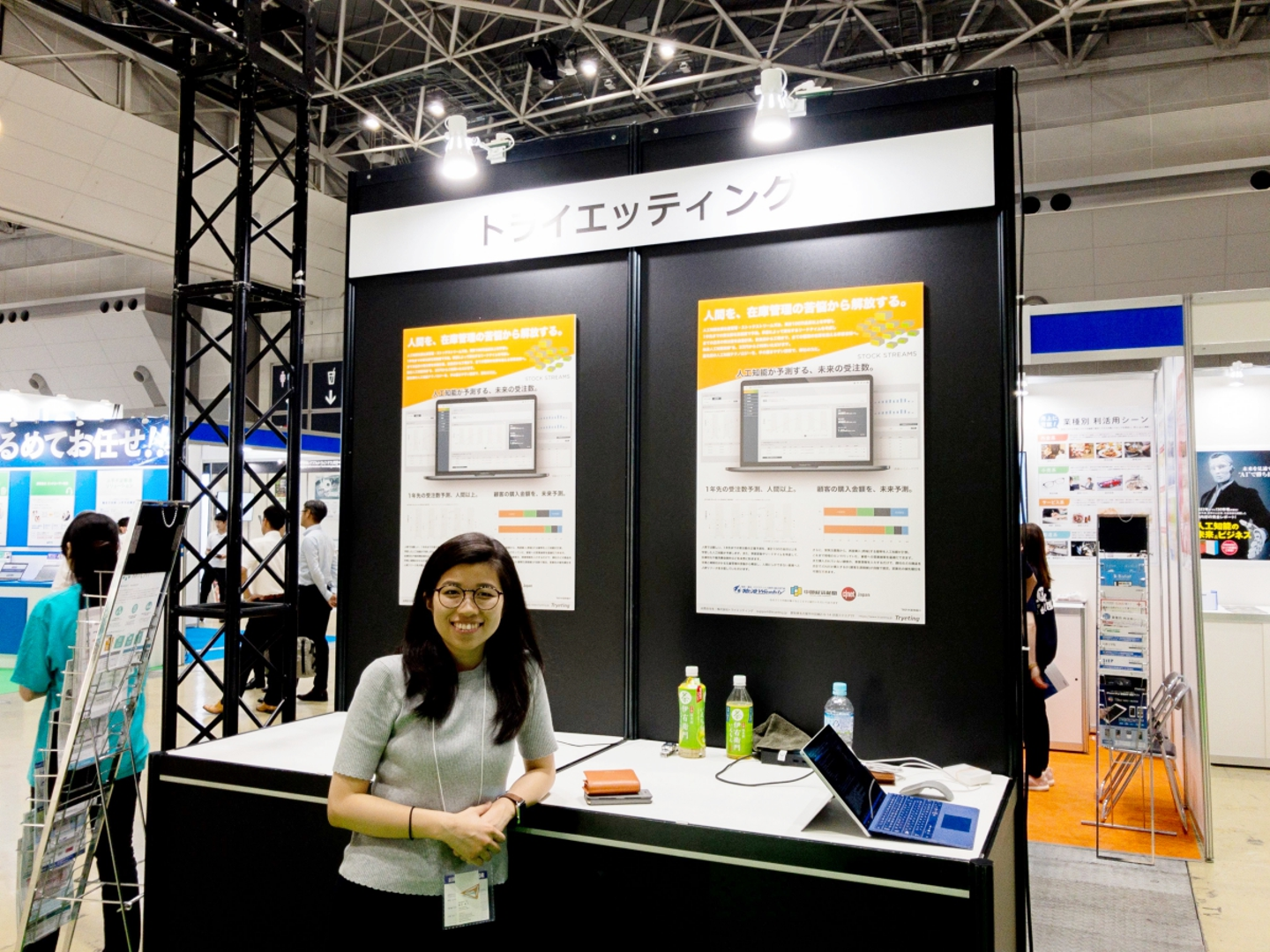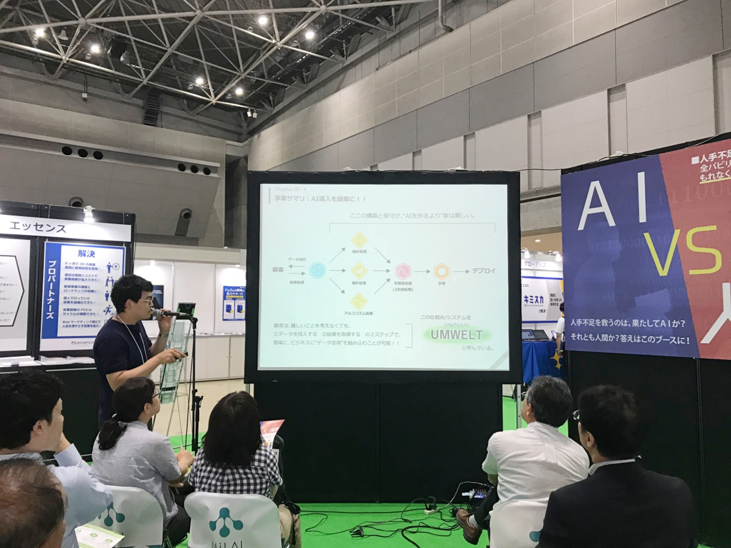 トライエッティングもブース出展し、多くの方に訪れていただきました。CEOの長江が、訪れた方に向けて、事業内容をご紹介。人手不足の解決策の1つとして、2ステップで導入できるAIプラットフォーム『UMWELT(ウムヴェルト)』について解説しました。