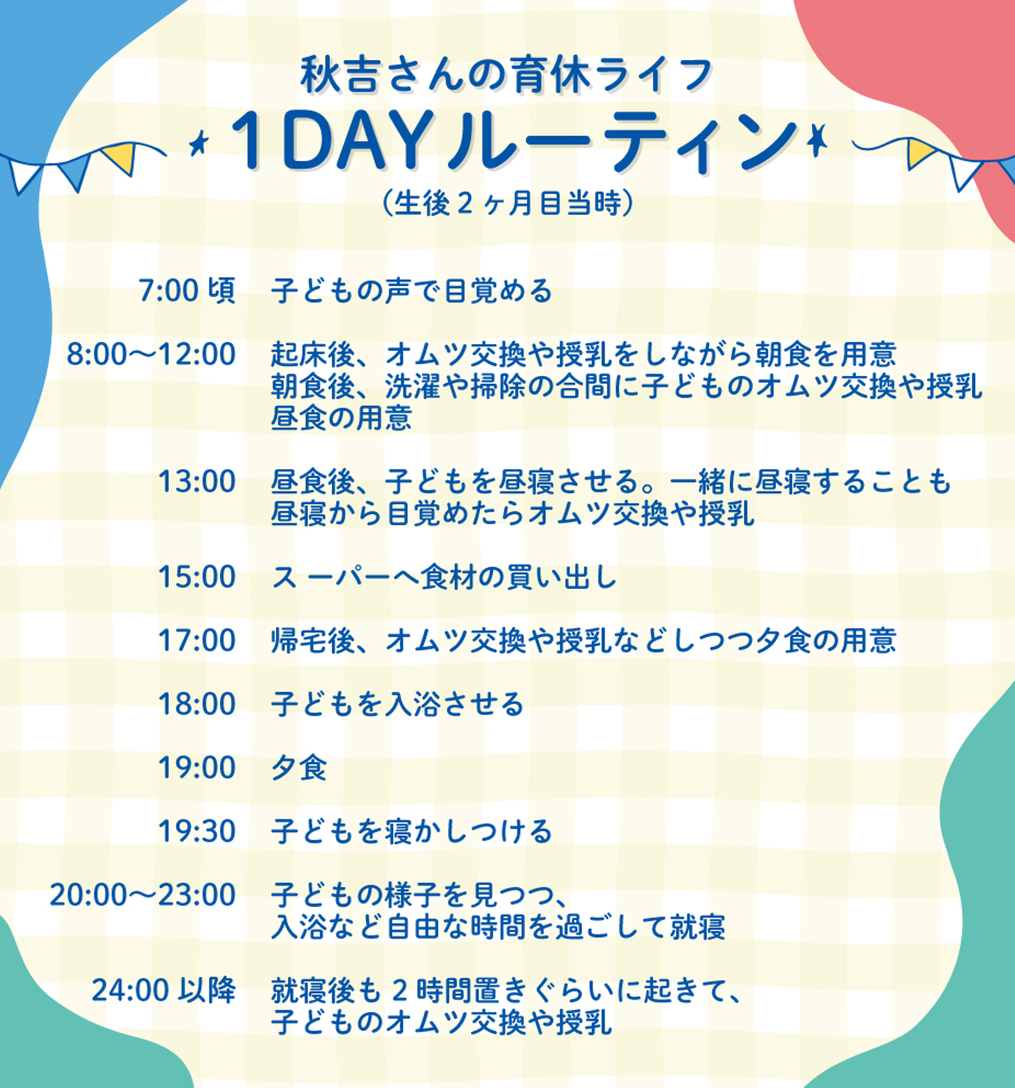 第1子が誕生した喜びとともに秋吉さんの日常にやってきたのが、赤ちゃん中心に目まぐるしく時間が過ぎていく育児ライフでした(1DAYルーティン図参照)。一般的に、初めての育児で多いのが「赤ちゃんが、なぜ泣いているのか?」と悩んでしまうことだそう。さっき授乳したはずなのに、なぜグズるのか。オムツが濡れているのか。それともお腹が痛いのか…… など、秋吉さんも授乳やオムツ交換のタイミングをつかむまでは苦労したのだとか。