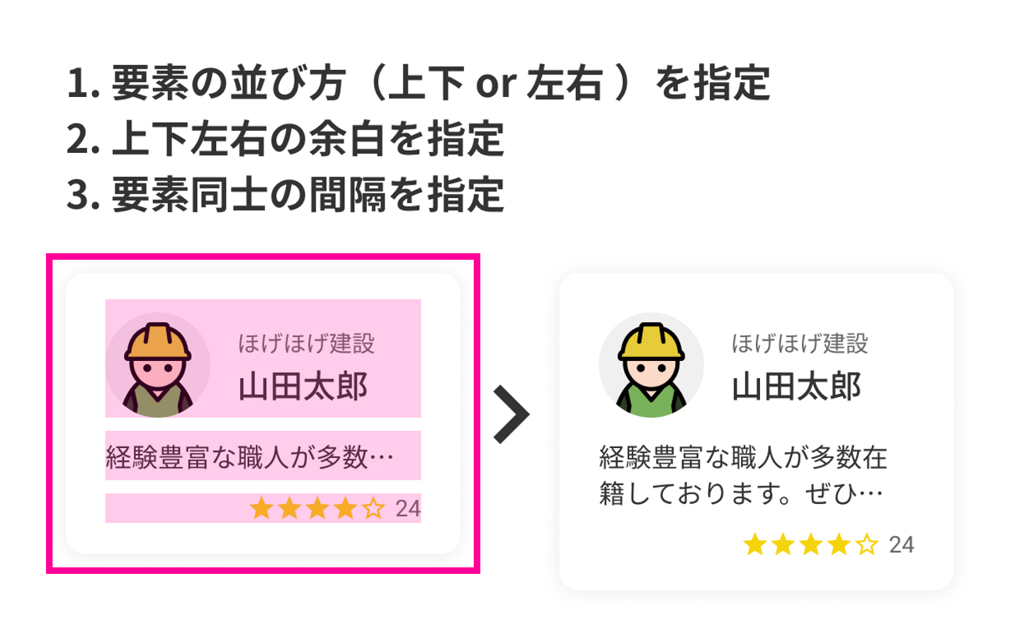 ちなみに、余白(padding)は上下と左右で指定するので、上の余白だけ広くしたい場合は、子要素に余白用の透明な図形を配置しておくことで調整可能です。