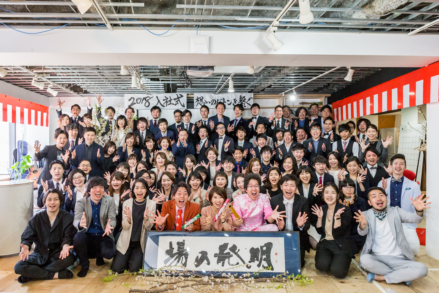 ▲2018年4月2日、入社式の様子。真ん中にいる3人が新卒入社したメンバー。今ではこんな規模になりました!