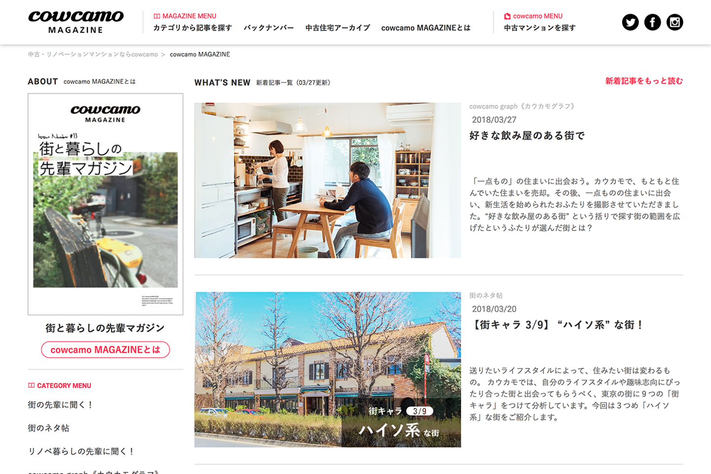 結果、「自分らしい住まい探しには、住みたいと思える『街』との出会い、そして理想の『暮らし』方との出会いが大切だ」という思いのもと、カウカモマガジン=「街と暮らしの先輩マガジン(東京の街の新たな魅力を生み出している「先輩」や、理想の暮らし方をしている「先輩」を紹介し、自分らしい住まい探しをお手伝いするウェブマガジン)」として位置づけ、コンテンツを再編集。