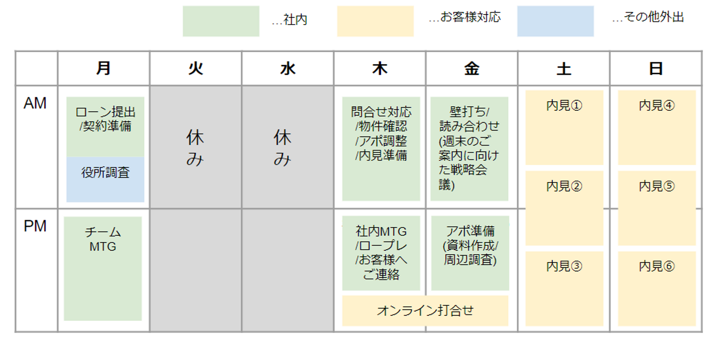 土日祝は内見のご案内が中心となるため、基本的に平日にアポイントの準備や社内MTGを行います。