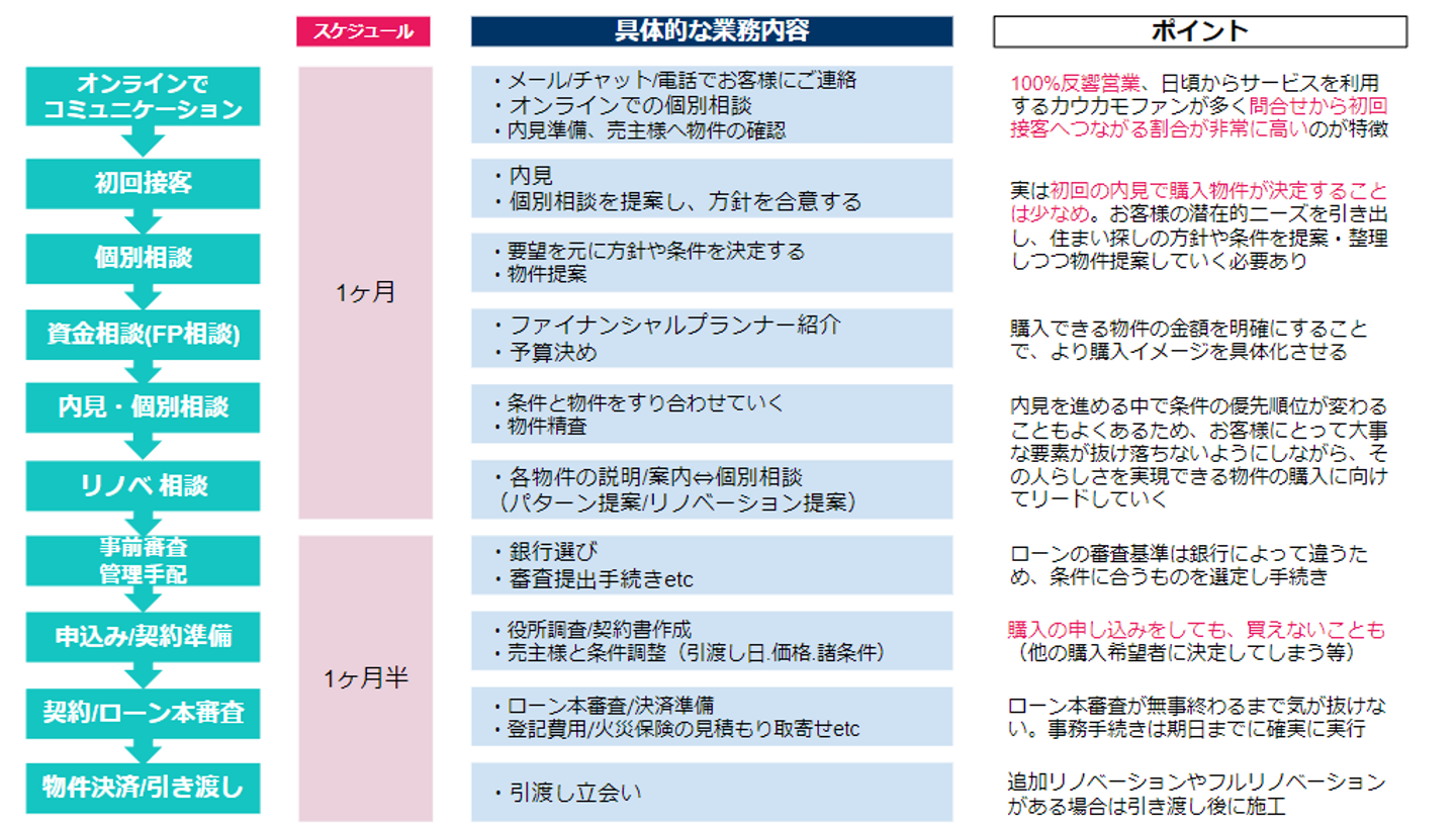 - 自社メディアであるcowcamoと連動しているため、cowcamoからお問い合わせ頂いた後はオフラインでの売買仲介サービス、リノベーションの施工、というようにこれらを全て統合して一貫してサポートできるのがカウカモエージェントサービスの特徴です