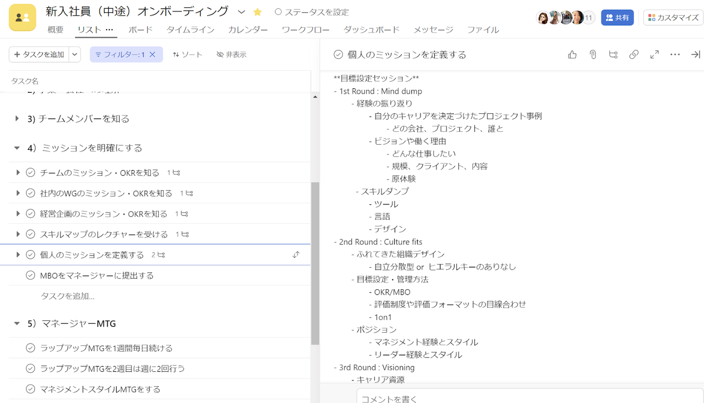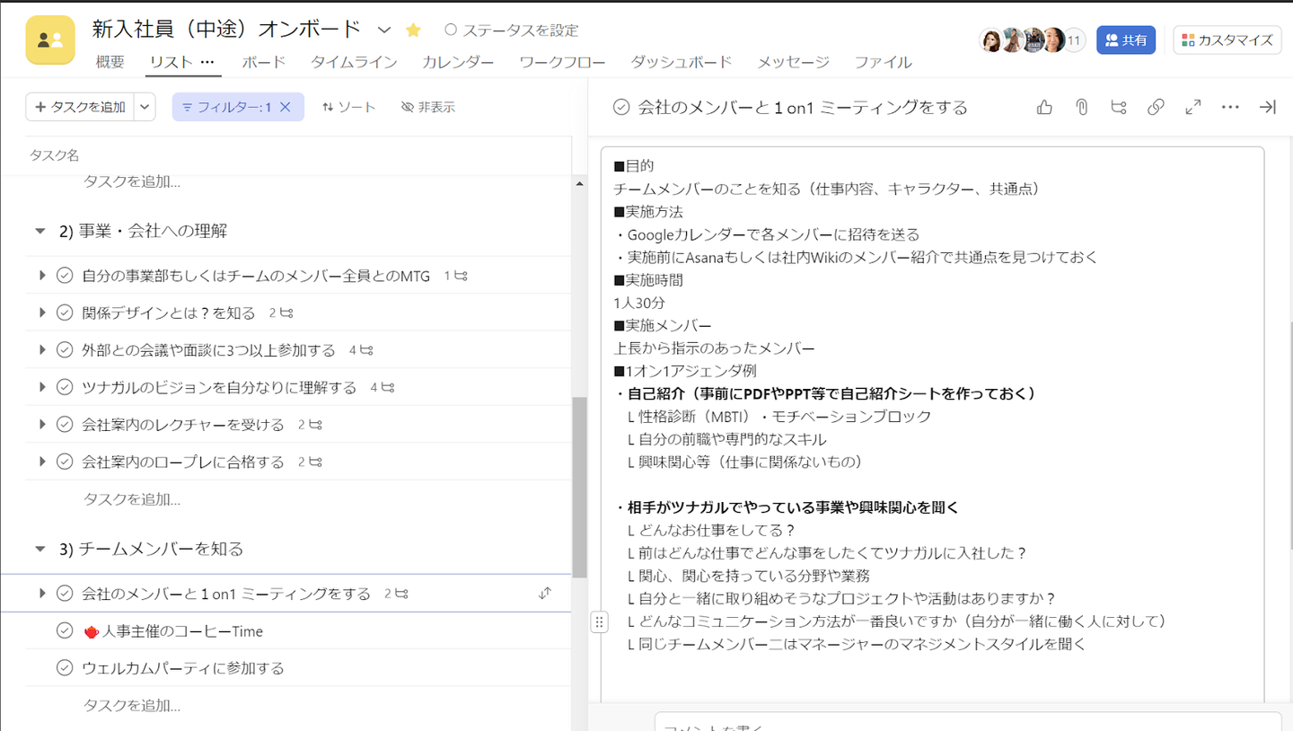 メンバーとのコミュニケーションを図るために、「チームメンバーとのMTG」「会社メンバーとの1on1」や、「全社のメンバー対象のコーヒータイム」「歓迎会」などが組み込まれています。