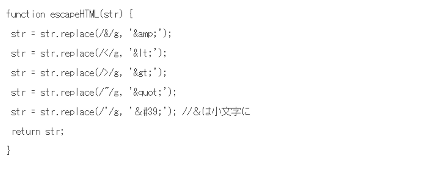 すぐできる対策であり、割と効果的なものがエスケープ処理です。これは問題を起こしうる特殊文字を文字参照に変換して、実行させないようにする処理です。対応する特殊文字は「&」「<」「>」「”」「’」の5つです。