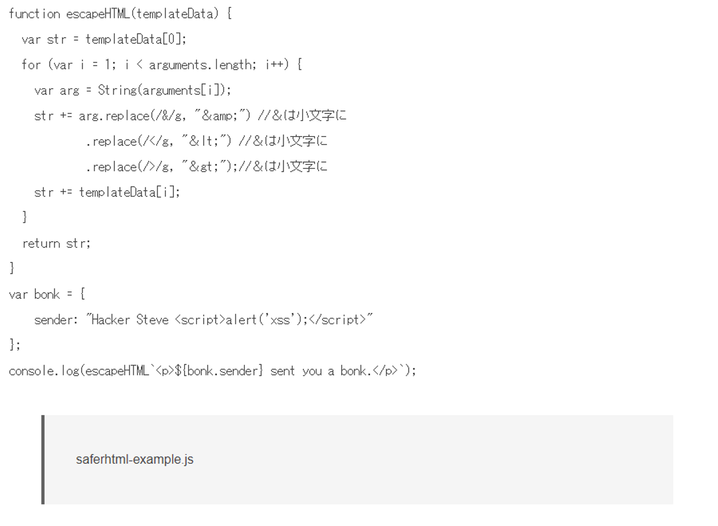 主に下記のソースになります。これは上述したエスケープ処理がない場合、確実にXSSの標的になり得ますし、この部分を使って悪用されるおそれがあるかもしれないからです。
