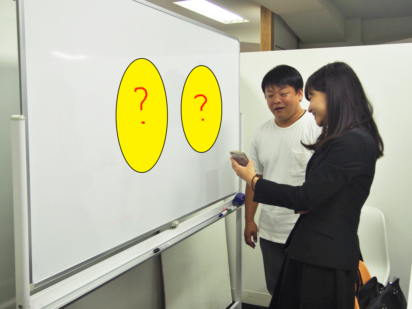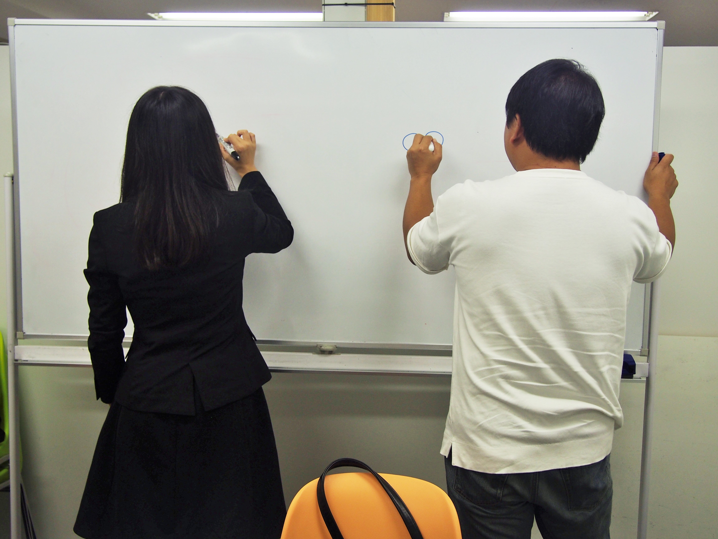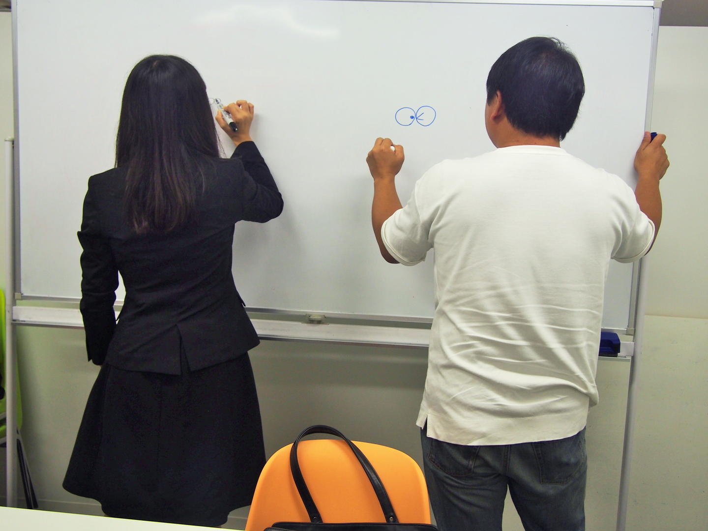 ホワイトボードに向かい、何かの絵をカキカキするお二人。