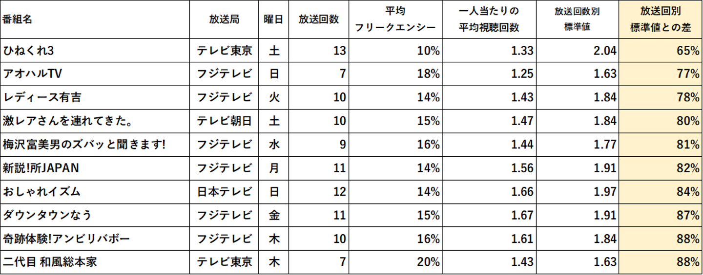 続いて、フリークエンシーの低い番組です。こちらは『放送回別標準値との差』が昇順で並んでいます。いかかでしたか?