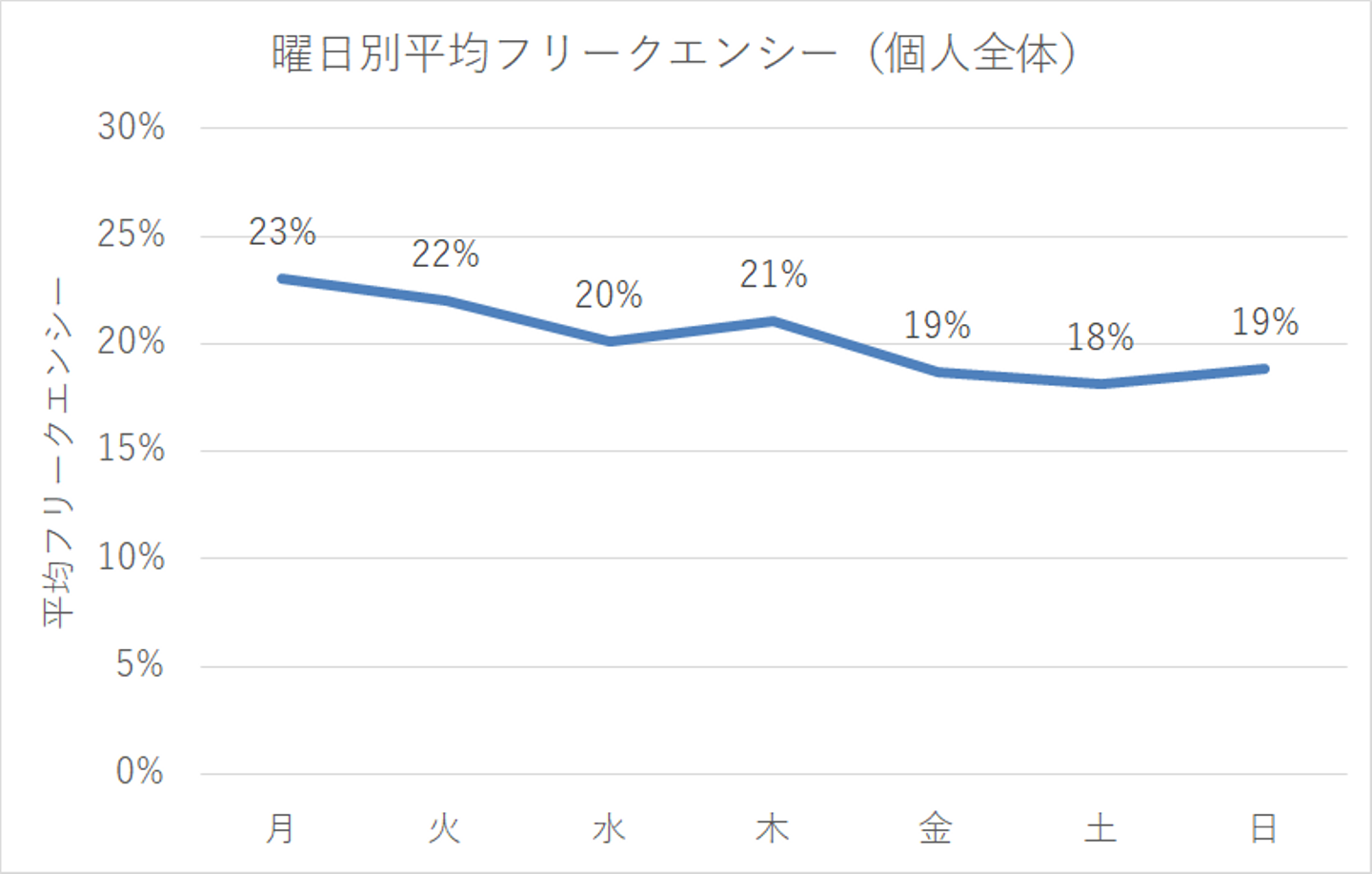 このように、曜日で平均フリークエンシーが変わることがわかります。週の前半のほうが高頻度で見られている番組が多いのです。週末は予定が流動的なので決まった時間にテレビを見られないのではないか、ということがデータで証明できます。