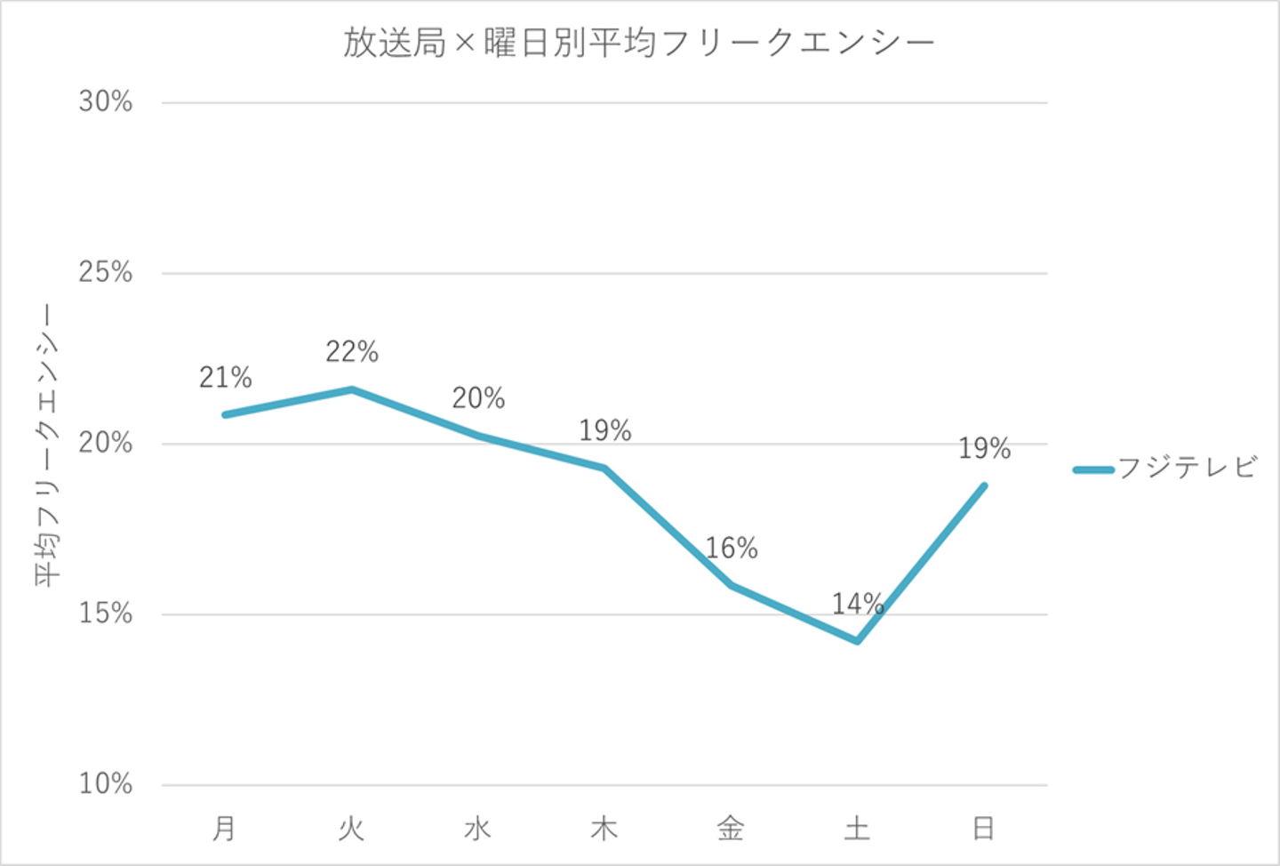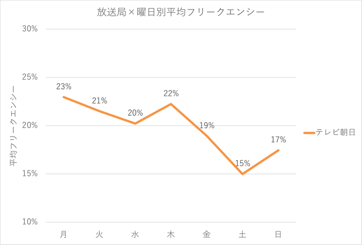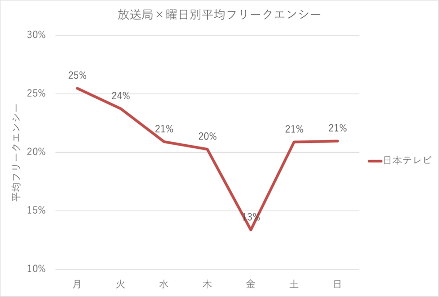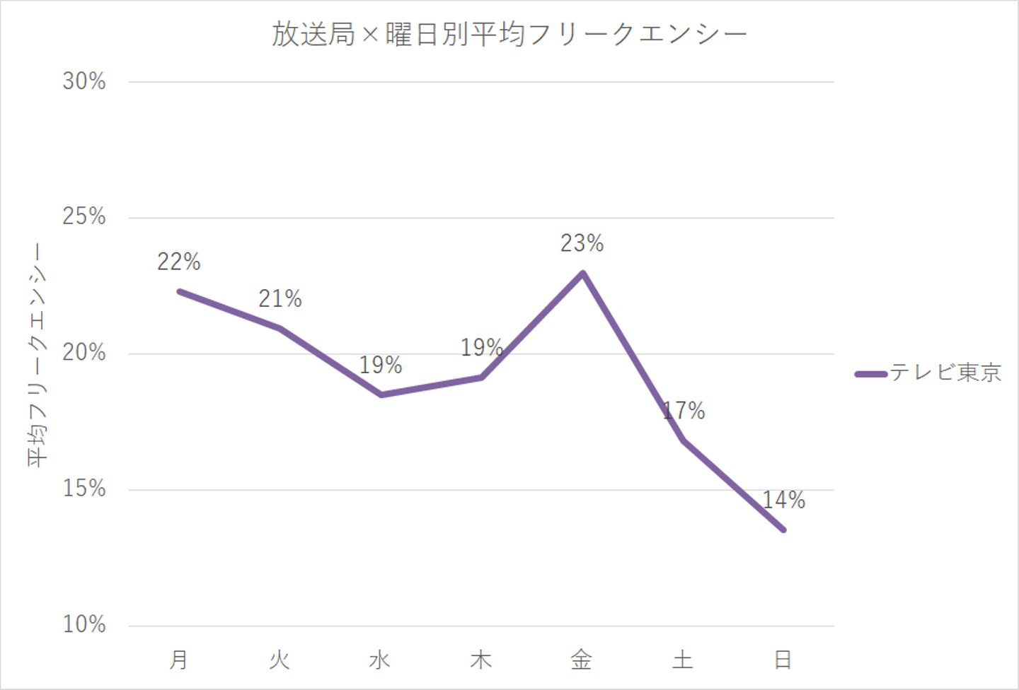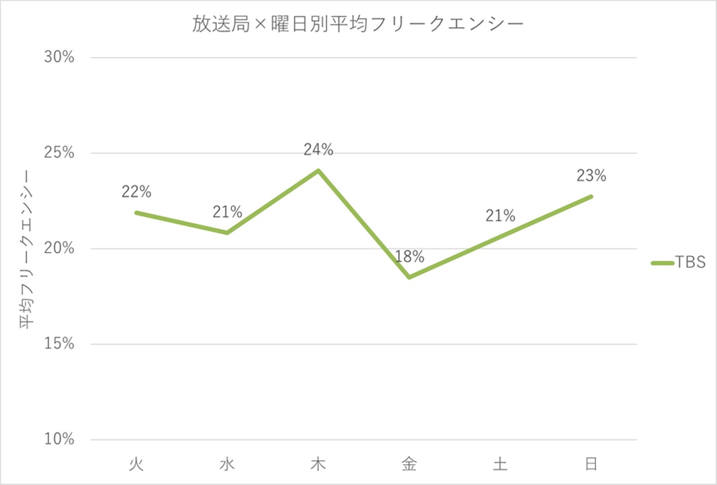 ここで面白いのは、5局平均だと金土日のフリークエンシーが落ちる傾向が見えたのですが、TBSはそれほど曜日によって差が出ていなかったり、逆にテレビ東京では金曜日にフリークエンシーが上がっていたりしていることがわかります。