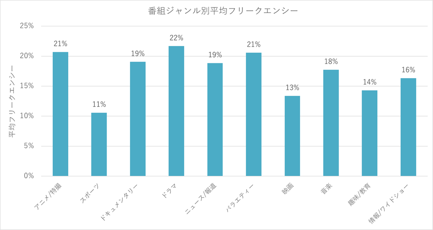 最もフリークエンシーが高いのはドラマで、次いでアニメ/特撮、バラエティという順になりました。