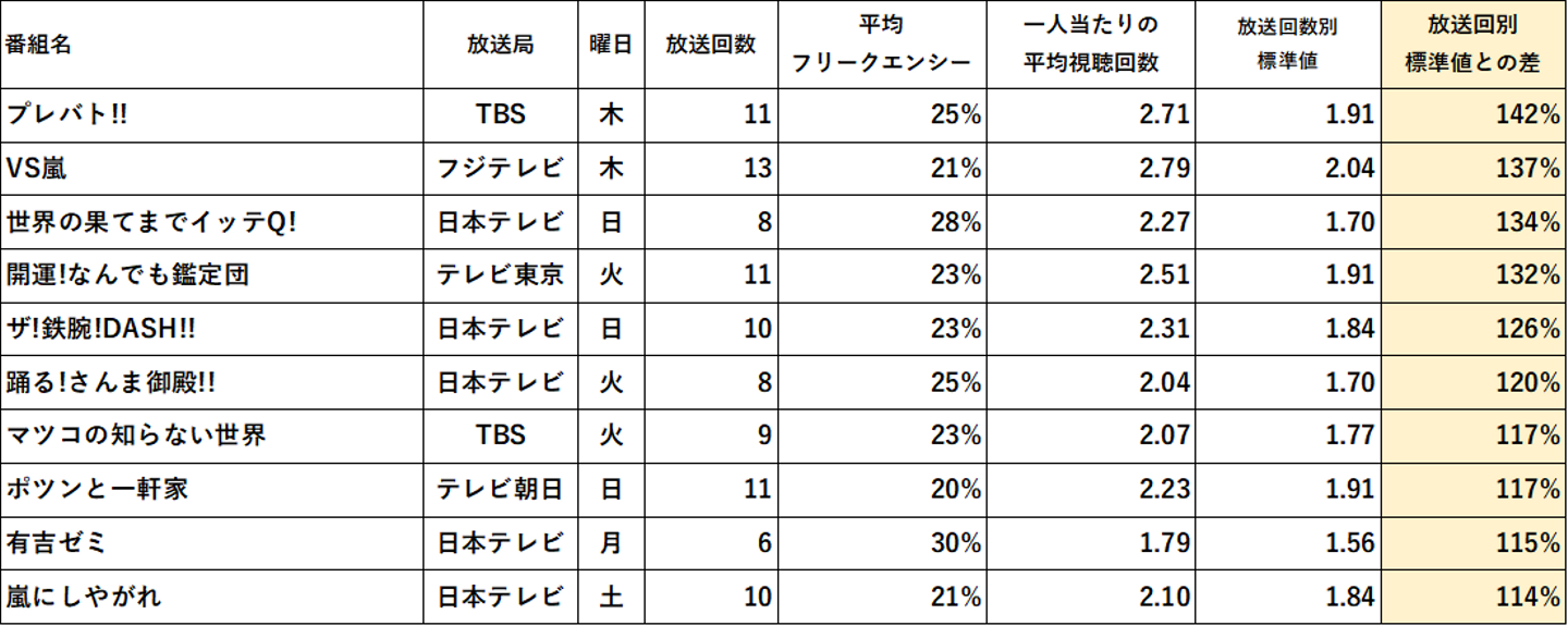 例えば、1位の「プレバト!!」は、11回放送の番組平均視聴回数が1.91回なのに対して、一人当たりの平均視聴回数が2.71回と高頻度で見られているので、2.71÷1.91=142%(11回放送のバラエティ番組の標準よりも42%頻度が高い)ということを意味しています。