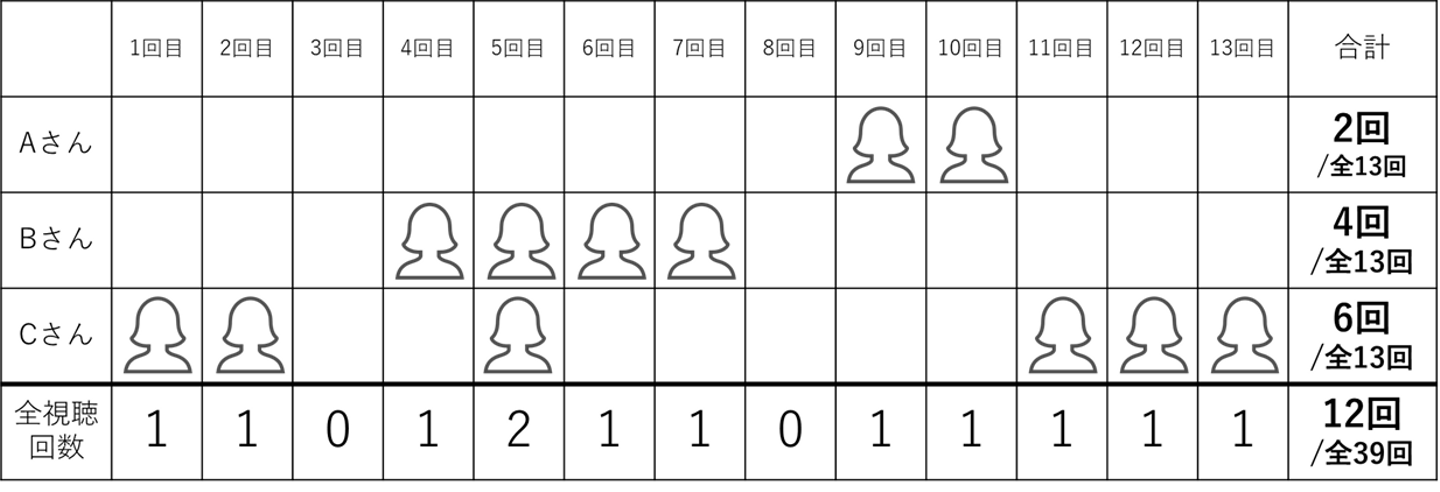 例えば調査対象が3人いて、ある番組の視聴行動が以下の図のような場合、この番組の平均フリークエンシーは12÷39=30%です。これに実際の放送回数を掛けた数字が番組の平均視聴回数となります。