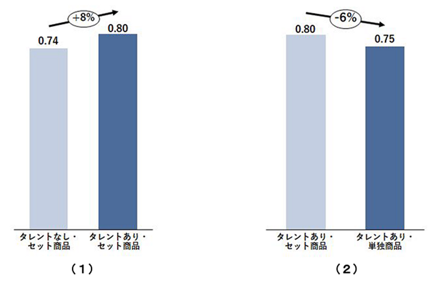 “単独商品/セット商品を使用する効果は、タレントがいる/いないで異なる” という興味深い法則も明らかになりました。