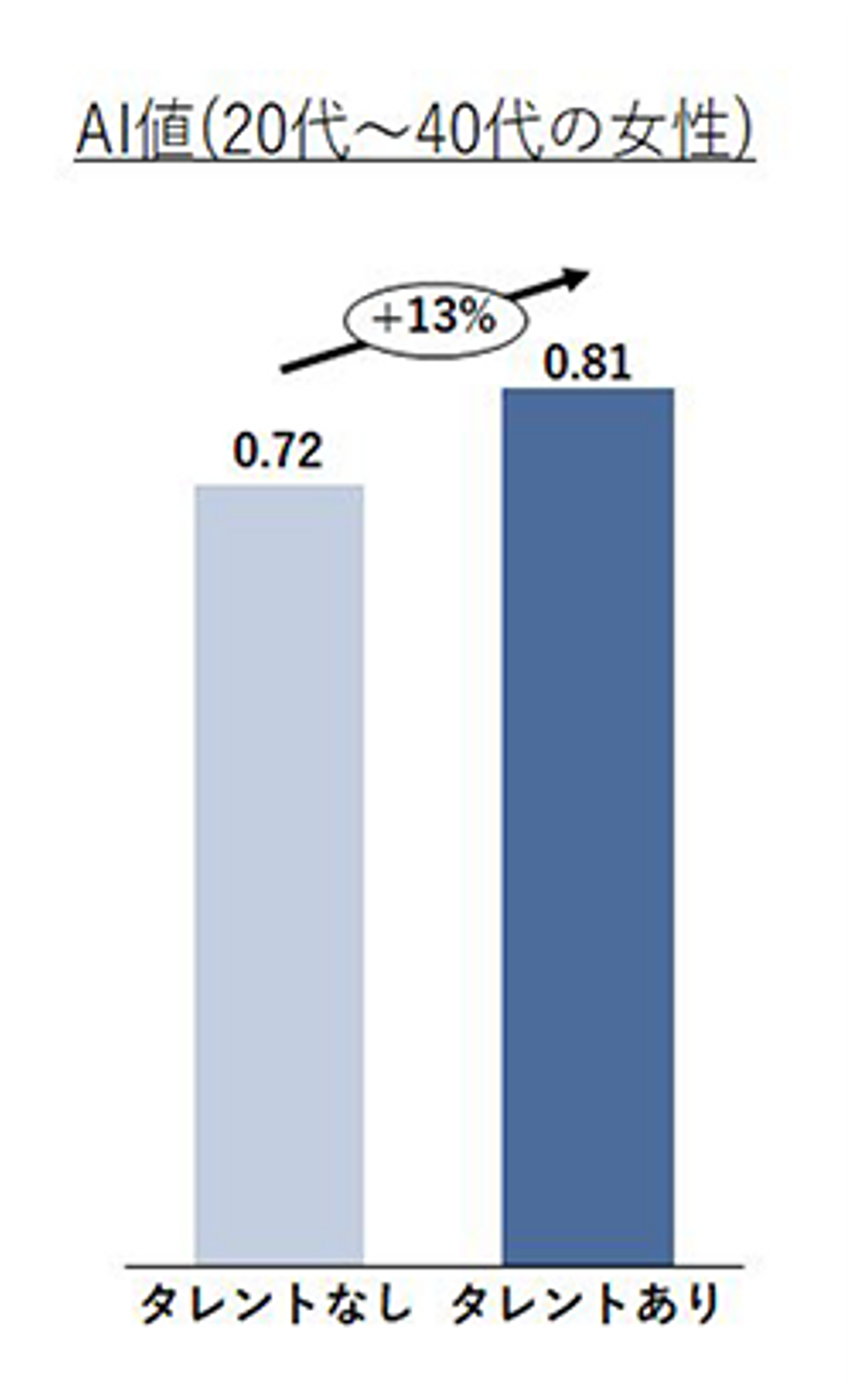 以下のグラフを見ても明らかなように、タレントが登場する/しないスキンケア製品のCMにおけるAI値には10%以上の差があります。