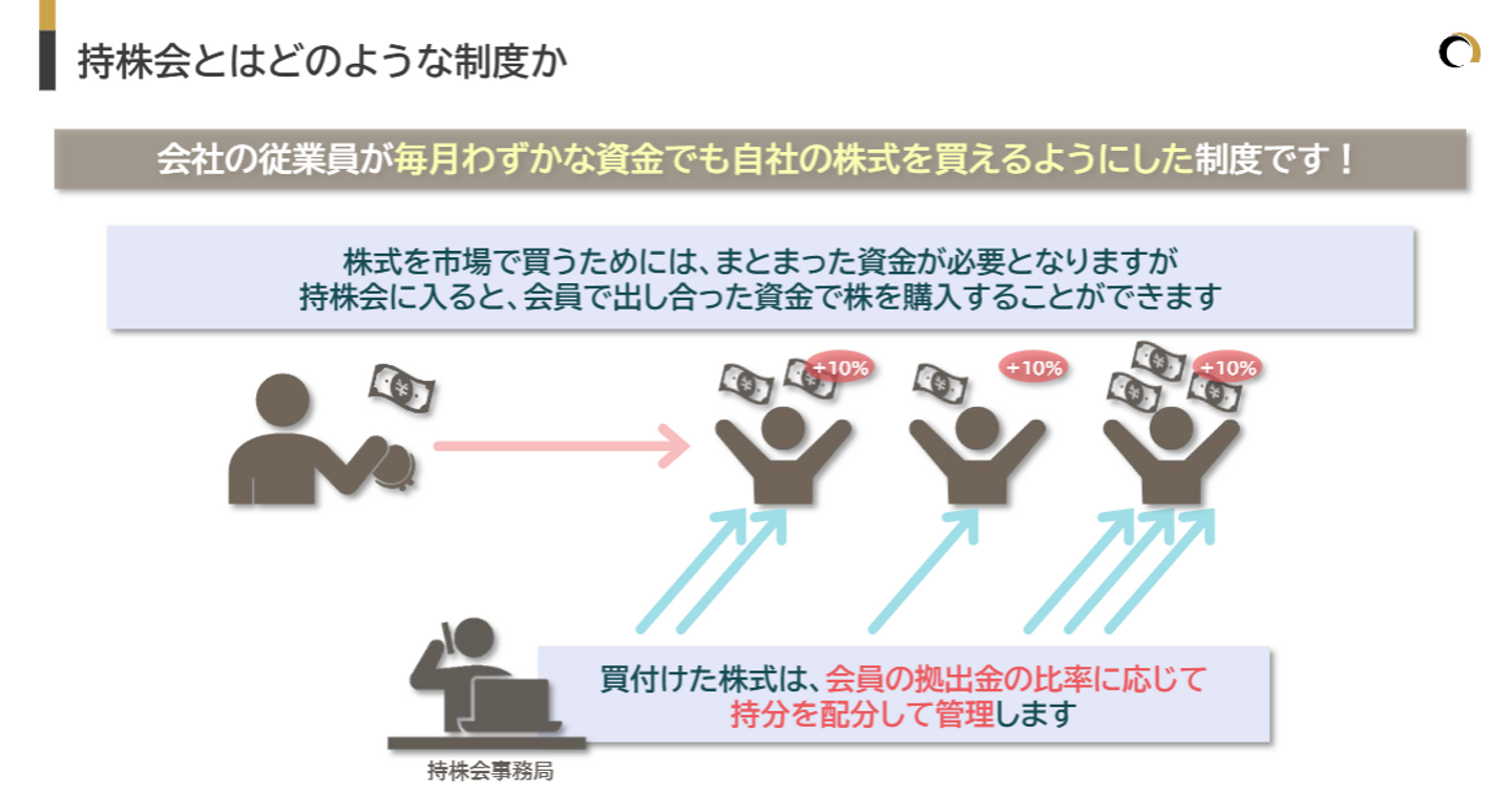 持株会とは従業員持株会とも呼ばれ、従業員から会員を募り、毎月支払われる給与などから天引きされる拠出金を原資として、当社株式を共同で購入し、拠出額に応じて持分を配分する制度です。