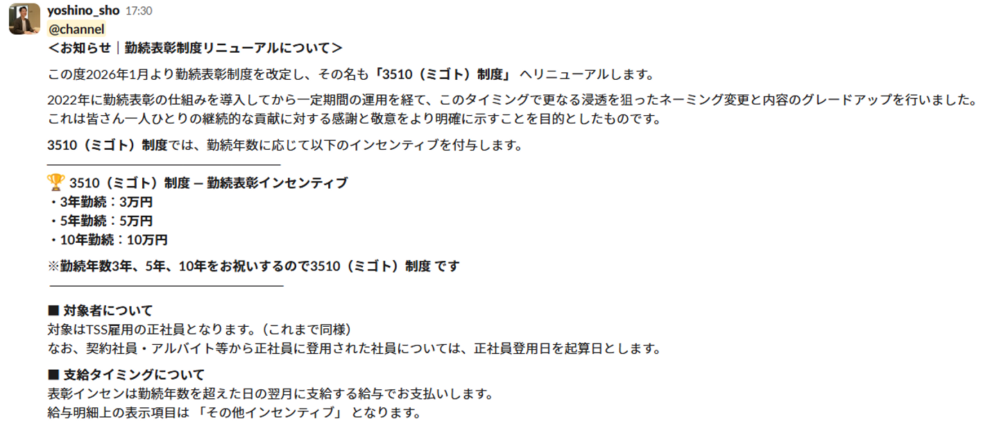 なお本制度は2026年1月に内容をアップデートし、メンバーの貢献に対する想いをより明確に伝えられる制度へとリニューアルいたしました。