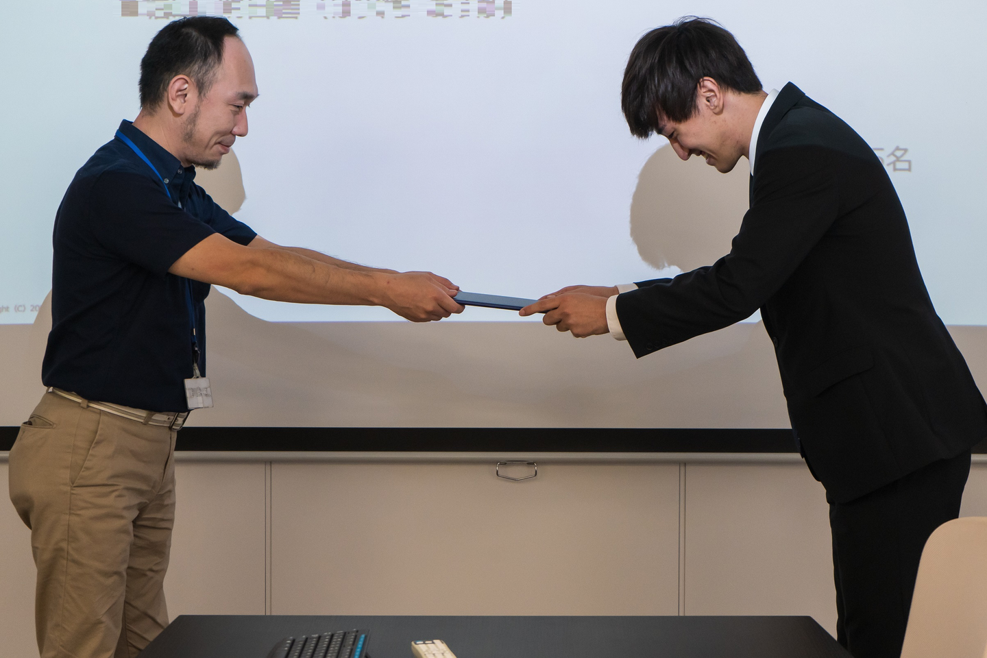 代表取締役社長の観堂より内定者のみなさんに内定証書を授与しています。