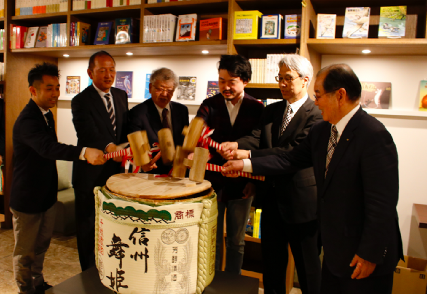 ▲(左から)UDS株式会社中川、小田急電鉄株式会社常務取締役 下岡祥彦氏、千代田区商店街連合会会長・合資会社高山本店 高山肇氏、NUMABOOKS代表 内沼晋太郎氏、株式会社岩波書店 常務取締役・桑原正雄氏、株式会社三省堂書店 亀井忠雄氏