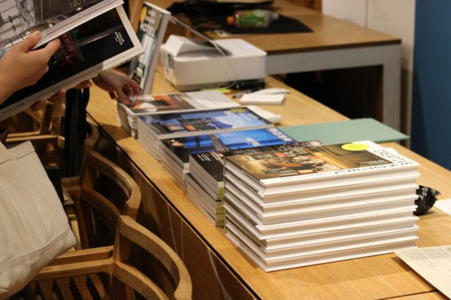 会場には数々の商店建築の書籍も展示。UDSのホテルを特集した商店建築増刊号「CREATIVE HOTEL & COMMUNICATION SPACE」を手にする人も。