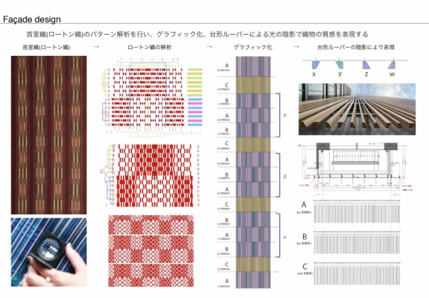 琉球王国時代の首里から伝わる「首里織」。一度は途絶えかけたものの復活した伝統技術で、計7種あるとされる技法のなかでも特に代表的な「ロートン織」のパターン解析を行い、グラフィック化。台形形状のルーバーを考案し、光の陰影により「首里織」のパターンが浮かび上がるようなファサードデザインとしました
