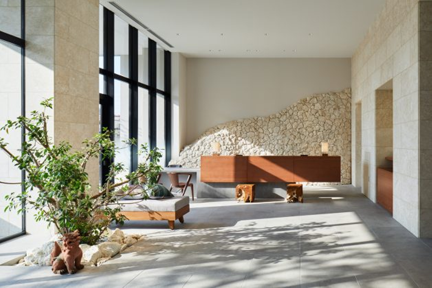 フロントロビーでは、外のランドスケープが屋内までつながるようなデザインに。大きな開口部を設け、ガジュマルの木をエントランスホールに配置しました。