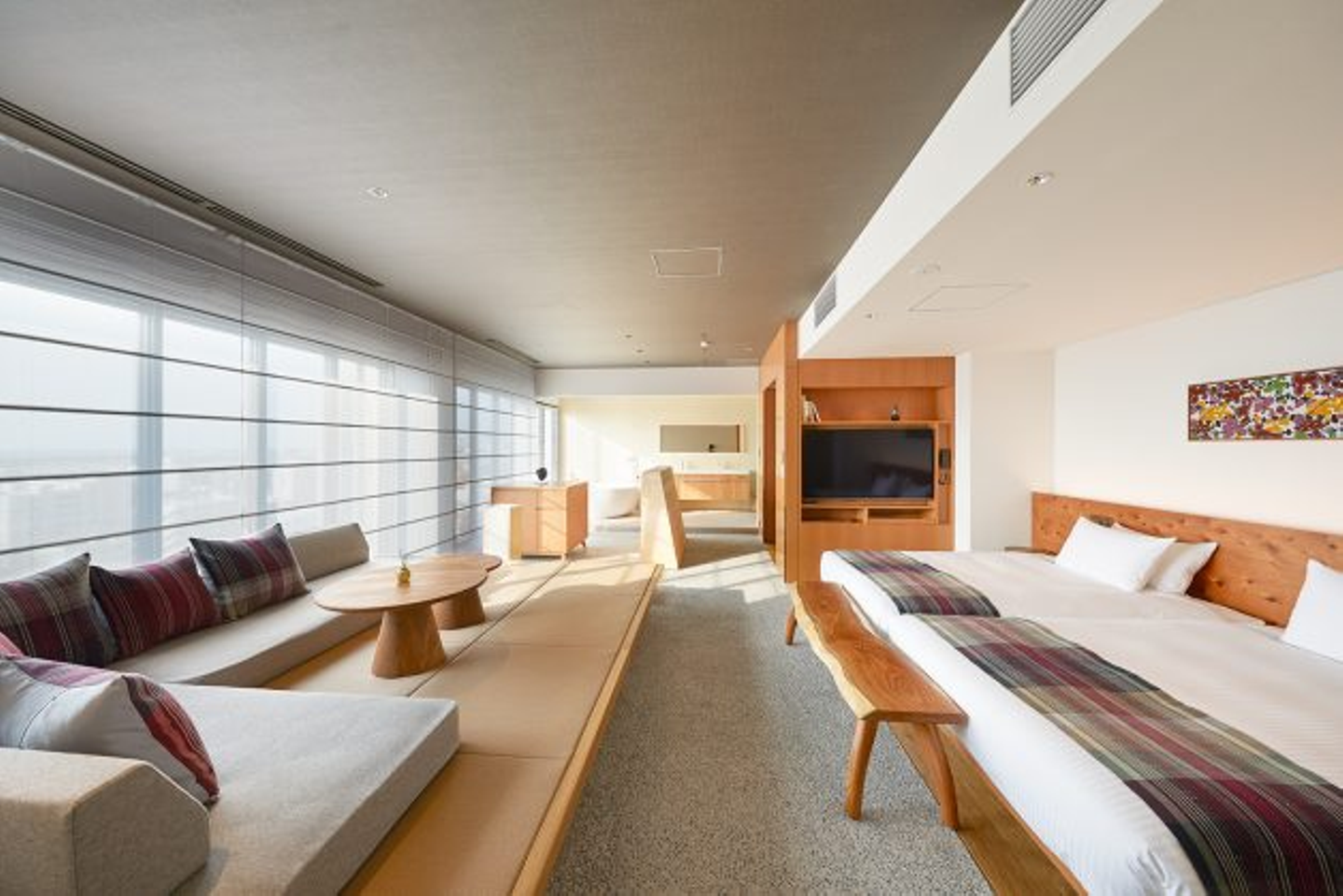 客室は、約16~19㎡のコンパクトなダブルルームと、約23~25㎡のツインルームがメインの全221室。最大4名でお過ごしいただけるタタミツインや、3面ガラス張り、かつ吹き抜けの客室パノラマスイートなど、多様な客室タイプを設けています。