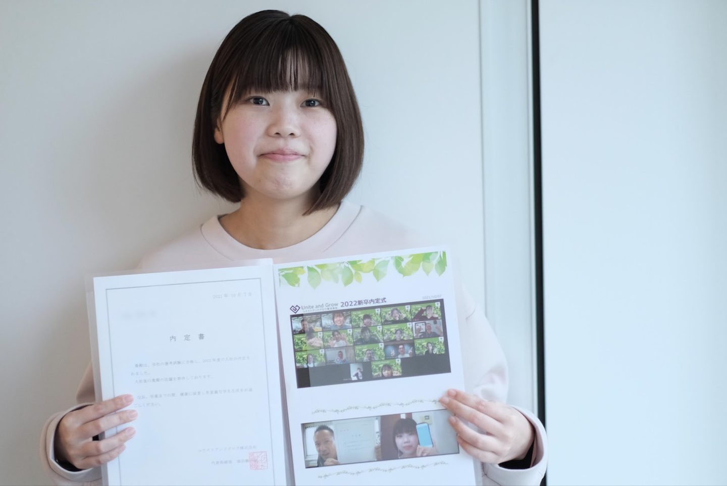 内定書(左)と内定証書授与式の様子(右下)です。今年の内定式では、オンライン越しに内定書を受け取り、後日実物をもらいました!