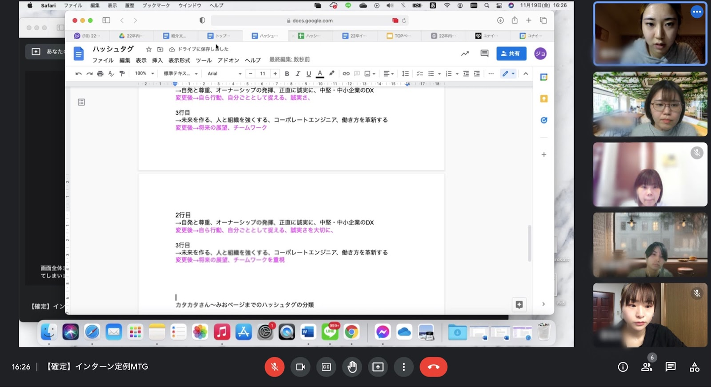 ITの勉強と並行して2021年9月から内定者インターンシップに参加し、他3名の同期と一緒に新卒採用ページの改修を進めています。
