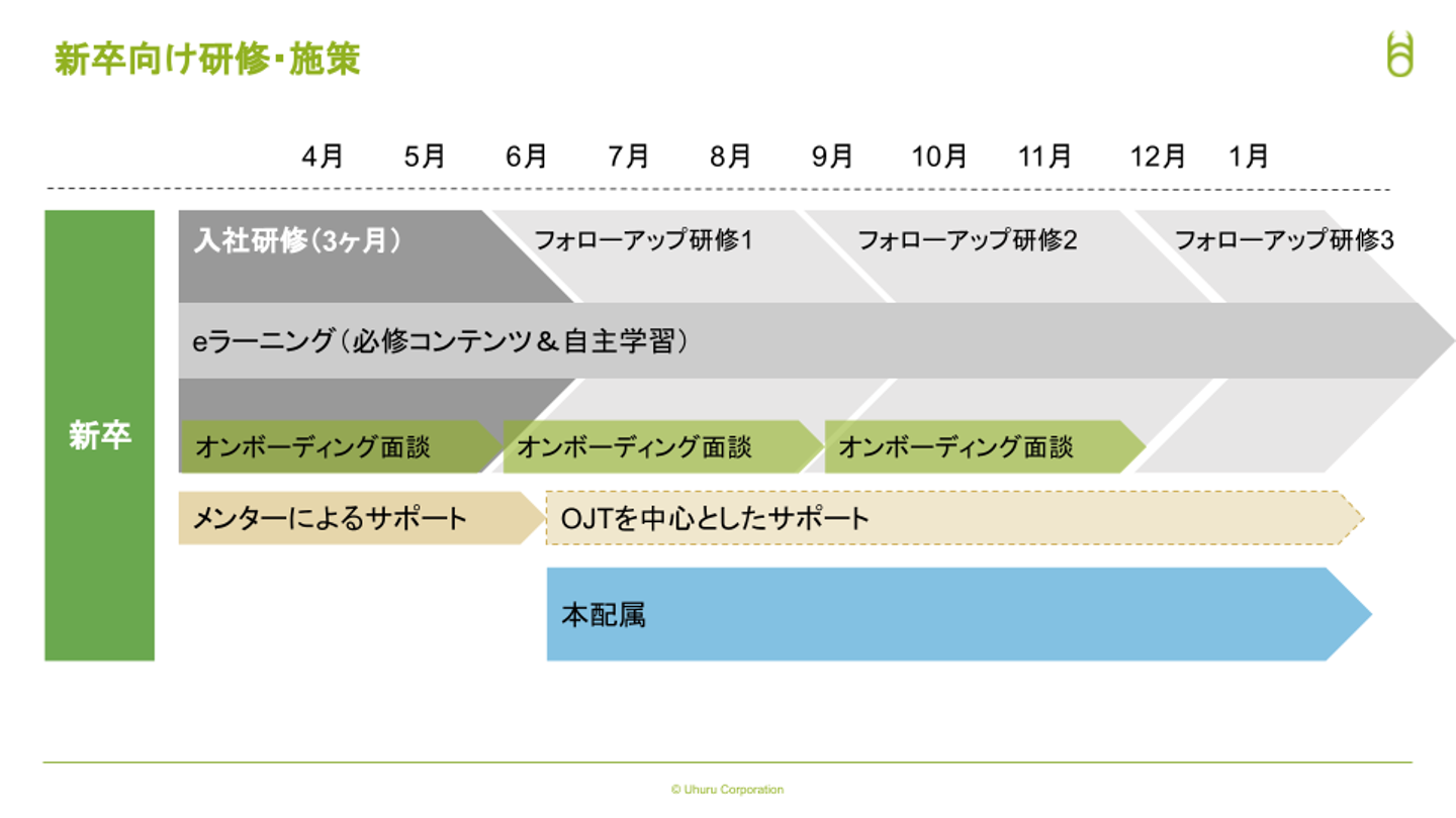 新入社員の皆様にも入社後すぐに動き活躍していただけるように、プログラミングスキルや社会人基礎力の向上を目的とした研修や、スムーズにウフルに馴染んでいただくことを目的としたオンボーディング施策を用意しています。